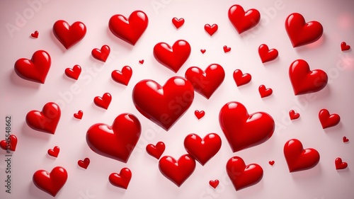 A romantic background featu many glossy red hearts of varying sizes scattered on a soft pink backdrop.