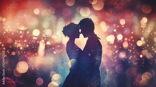 A romantic design with a soft ethereal feel reminiscent of blurry carnival lights glowing in the background as two lovers embrace.