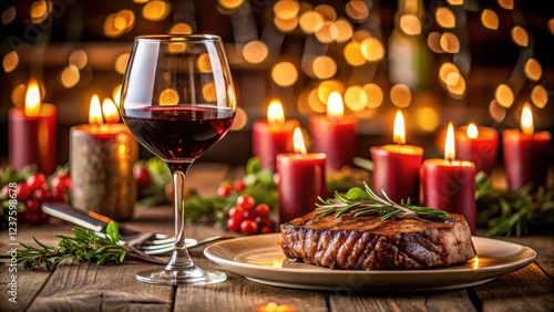 A romantic dinner setup with a tender grilled steak and a glass of rich red wine on a candlelit table, surrounded by elegant decor and soft lighting, candlelight, red wine