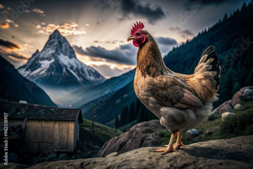 rooster, chicken, bird, mountain, rock, peak, sky, cloud, sunset, dawn, sunrise, alpine, swiss, alps, nature, scenery, landscape, rural, farm, field, green, brown, feather, beak, crest, eye, talon, claw, foot, wing, tail, foliage, grass, hill, vale, horizon, foreground, background, wooden, building, shed, house, barn