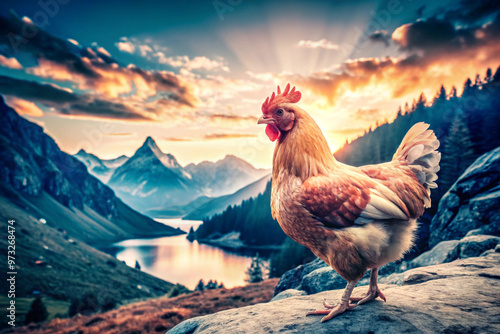 rooster, hen, chicken, bird, mountain, mountain, meadow, field, grass, green, sky, cloud, blue, snow, peak, summit, sunset, sunrise, horizon, nature, landscape, animal, wildlife, rural, farm, agriculture, outdoors, scenic, majestic, peaceful, calmness, beauty, picturesque