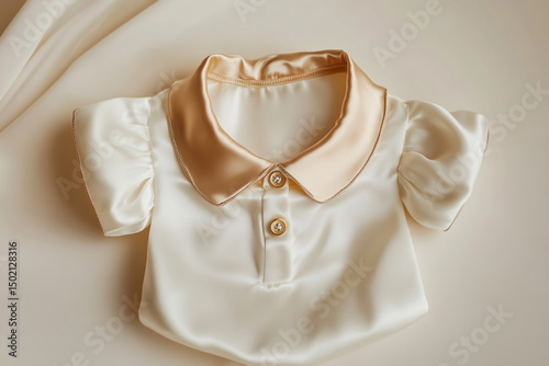 A rose gold and white silk cotton Baby wear with a silky golden collar and buttons. isolated on light beige aesthetic backdrop