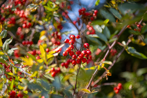 A rosehip bush with beautiful bright red fruits on a clear sunny day. Flora floristry landscaping plants flowers.