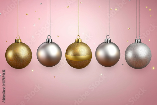 A row elegant Christmas ornaments in gold and silver, suspended against a soft pink background,