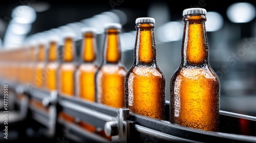 A row of beer bottles on a conveyor belt