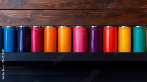 row, colourful, tumbler, sitting, top, shelf, bottle, colours, container, wax crayons, line, arranged, black, against, wooden, background, tumbler, left, side, blue, middle, 1, red, second, orange, third, pink, fourth, yellow, fifth, purple, sixth, green, seventh, colours, vibrant, racked, out, dark, wood