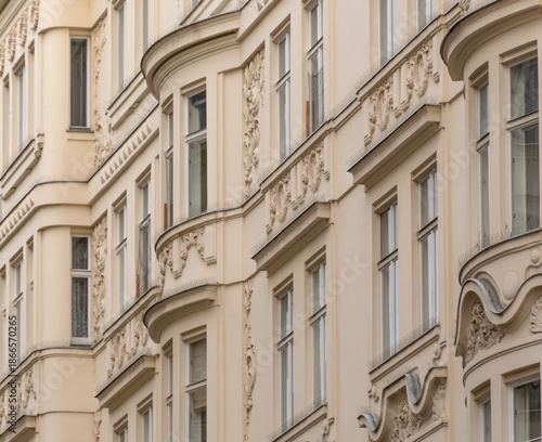 A row of facades of historic residential buildings in Vienna with smooth lines and classical architecture