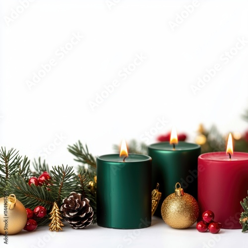 A row of festive candles in red, green, and gold, surrounded by pine garlands, isolated on a white background