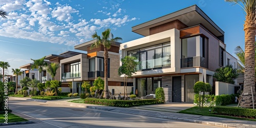 a row of houses with palm trees and a street in front of them on a sunny day with blue sky