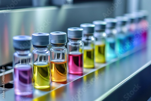 A row of medical vials lined up neatly on a stainless steel tray, each filled with clear and colored solutions, with a sterile, high-tech laboratory background