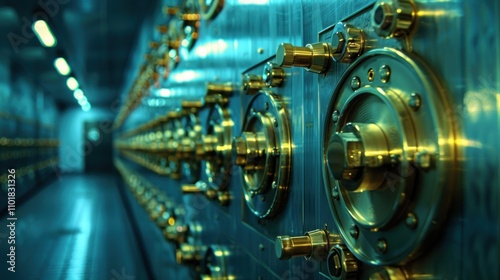 A row of metallic vault doors in a secure facility, emphasizing safety and protection.