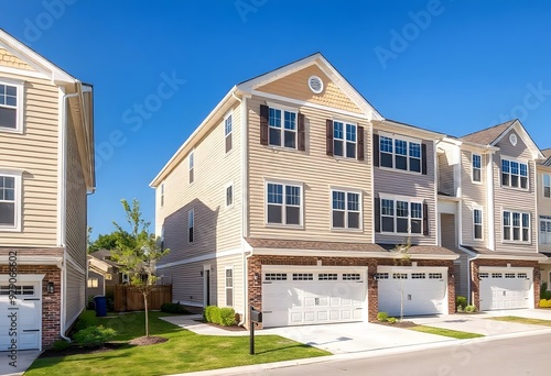 A row of modern townhouses with beige siding, blue shutters, and attached garages. The houses are set against a clear blue sky