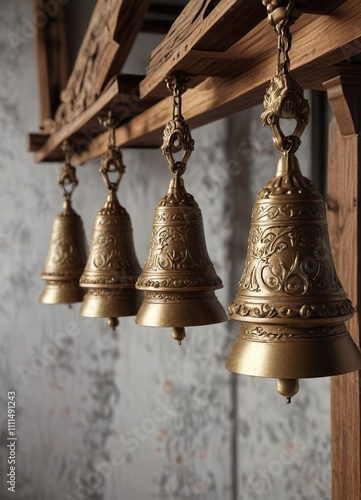 A row of ornate bells hanging from a wooden beam , wooden ornament, ornate bell, Christmas decoration