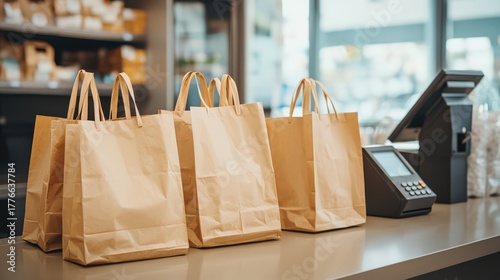 A row of paper shopping bags sits on a counter next to a modern checkout register in a retail setting.