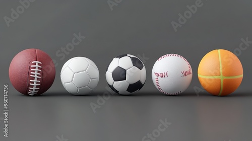 A row of sports balls, including a soccer ball, a baseball, and a football