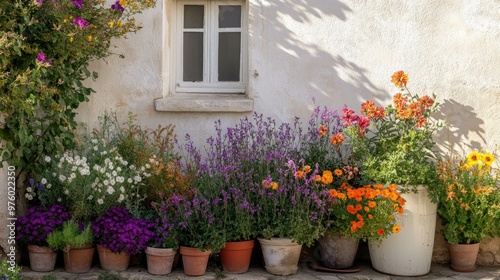A row of terracotta pots filled with colorful flowers and plants sits in front of a whitewashed wall with a window.