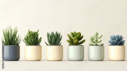 A row of tiny succulent plants in pastel-colored pots, set against a pale ivory background