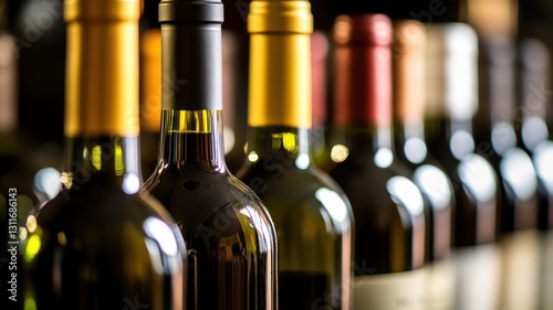 A row of wine bottles in focus, soft background blur; elegance and craftsmanship in every detail.