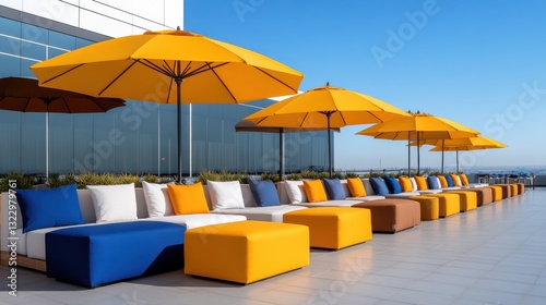 A row of yellow umbrellas and orange ottoman chairs are set up on a patio