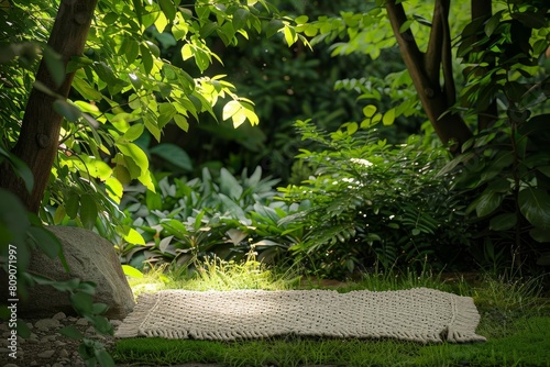 A rug is on the grass in a garden