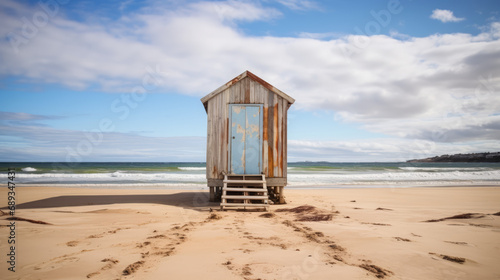 A rustic beach hut stands alone on the beach with the calm sea in the background.