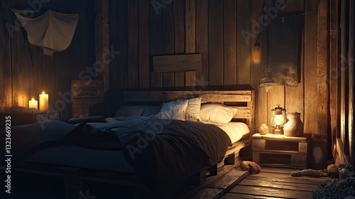 A rustic bedroom with pallet furniture and soft, warm lighting.