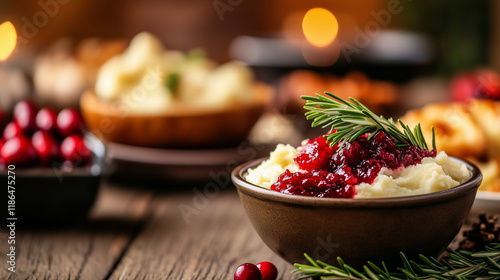 A rustic bowl of cranberry sauce accented by fresh rosemary sprigs, surrounded by Thanksgiving sides like mashed potatoes and gravy on a richly grained wooden table.