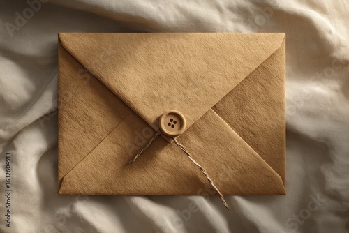 A rustic brown paper envelope secured with a wooden button and string, resting on soft, neutral-toned fabric, creating a warm and inviting atmosphere for communication.