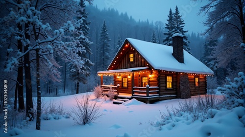 A rustic cabin in a snowy landscape, illuminated by warm Christmas lights