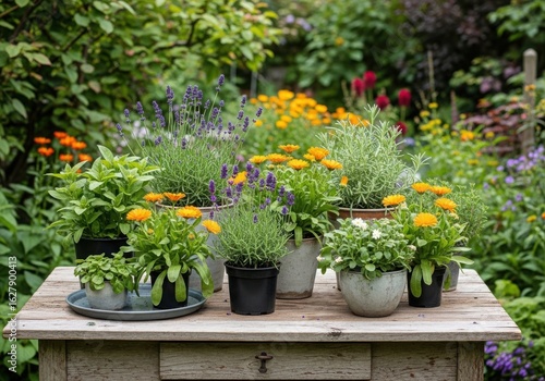 garden, flower, plant, table, pot, lavandula, marigold, rosemary, herb, arrangement, rustic, wooden, flora, foliage, green, orange, purple, summer, spring, country, decoration, natural, still, life, collection, variety, display
