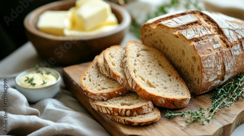 A rustic table setting featuring a loaf of freshly baked bread and slices of toasted bread, surrounded by butter and herbs for a warm, inviting atmosphere.