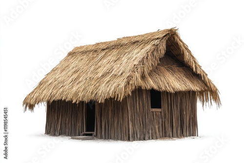 A rustic thatched hut showcasing traditional architecture with a straw roof, isolated on a pristine white background