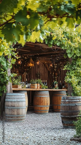 A rustic vineyard with grapevines, wooden barrels, and a tasting area