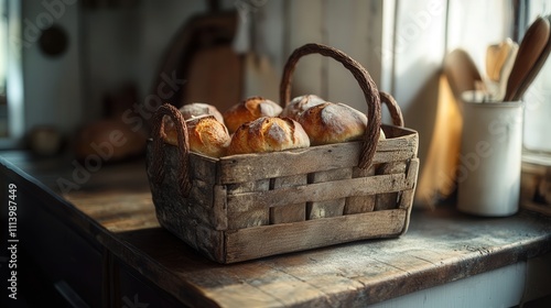 A rustic wooden basket with an old-fashioned charm, filled with freshly baked bread and sitting on a kitchen counter, creating a warm, homey atmosphere