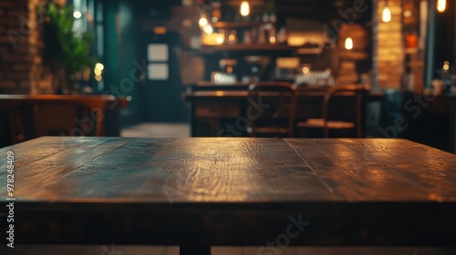 A rustic wooden table in a cozy café setting with warm lighting and a blurred background.