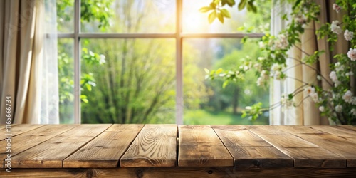 A rustic wooden table set against a backdrop of a sunlit window with lush greenery and blooming flowers