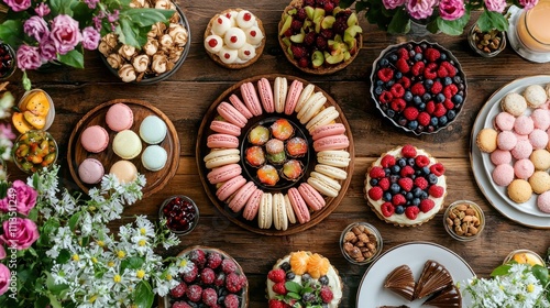 A rustic wooden table with a spread of gourmet treats, including macarons, fruit tarts, and mini cheesecakes, surrounded by flowers