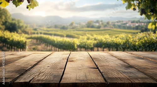 A rustic wooden tabletop with a blurred background of a beautiful vineyard, perfect for showcasing products or creating a sense of peace and tranquility.
