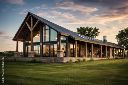 A Rustic Yet Modern Renovated Barn Home Nestled in the Heart of a Lush Green Meadow Under a Clear Blue Sky