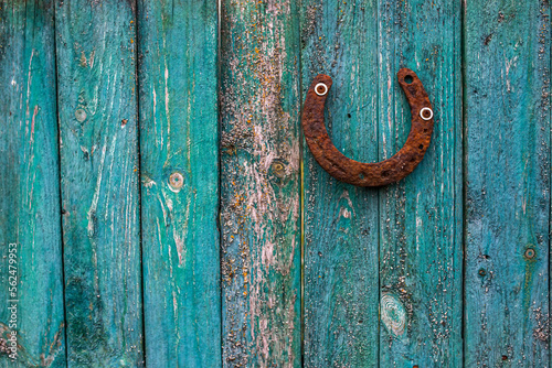 A rusty horseshoe on a wooden turquoise fence made of old weathered boards. Luck Concept