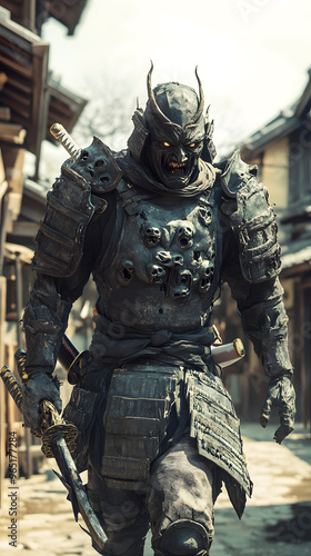 A samurai wearing menacing armor made from oni material, with a helmet, walking through an Edo period town during bright daylight