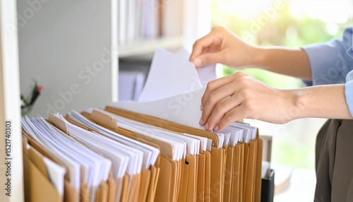 A scene where documents are organized in files and the person checks the files to find documents