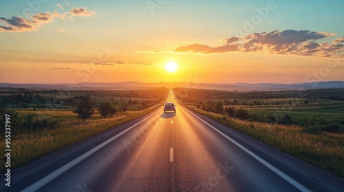 A scenic highway stretching into the distance, with a car driving into the sunset during a summer vacation.