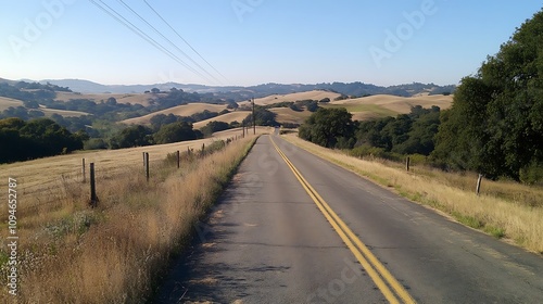 scenic, open, road, stretching, distance, rolling, hill, bathe, soft, morning, light