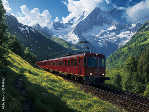 A scenic train journey through the Swiss Alps, with a red train winding through green valleys and dramatic mountain landscapes.