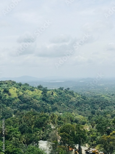 A scenic view of lush green mountains with an industrial zone nestled at the base, blending nature’s beauty with human development