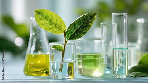 A scientific plant lab displays beakers filled with growing plants illuminated by soft morning sunlight enabling photosynthesis.
