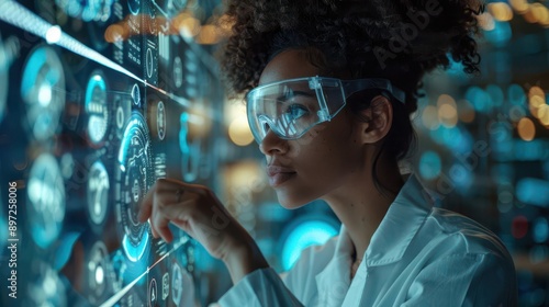 A scientist interacts with advanced technology, showcasing innovation in a modern lab environment.