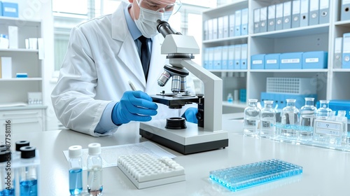 A scientist wearing safety goggles and gloves leans over a microscope, examining a sample