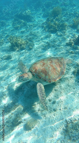 A sea turtle swims gracefully in the clear, turquoise ocean water over a sandy seabed with coral formations, showcasing its mottled shell and flippers